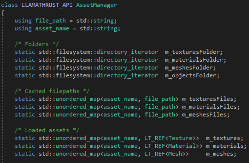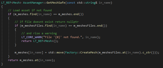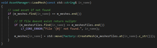 But sometimes you ask for a file that is not there so I set a folder for every asset type and store the name with the filepath in a unrodered_map so when I ask for an asset to be loaded it first search for the asset to exists. I did not test the performance of this technique maybe is unnecessary since a function exists(file_path) is in std::filesystem.